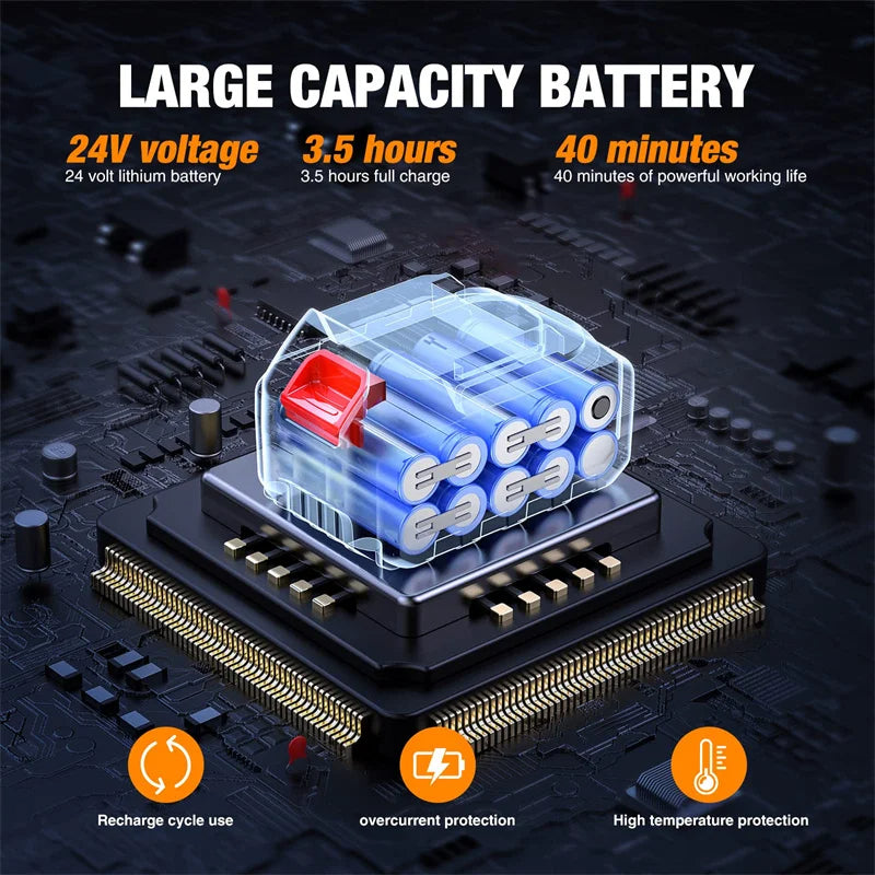 A: Around 25–30 minutes of continuous use, depending on pressure settings and battery capacity.