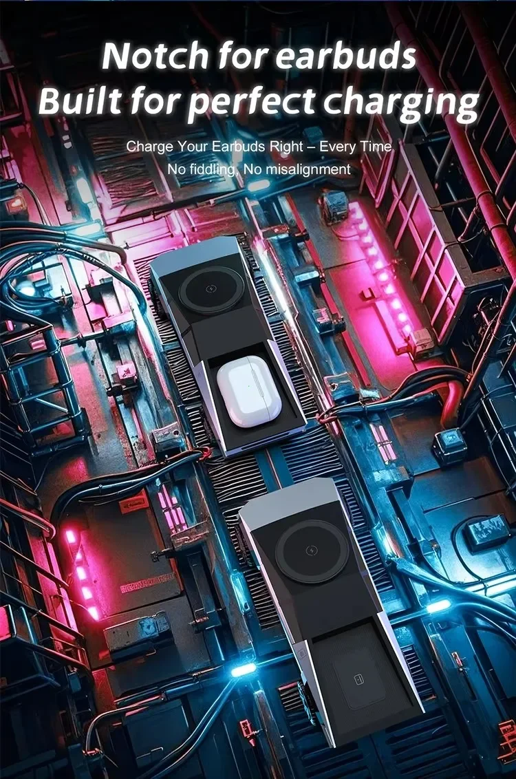 3-In-1 Wireless Charging Station – Charge phone, earbuds, and smartwatch together in one compact unit.