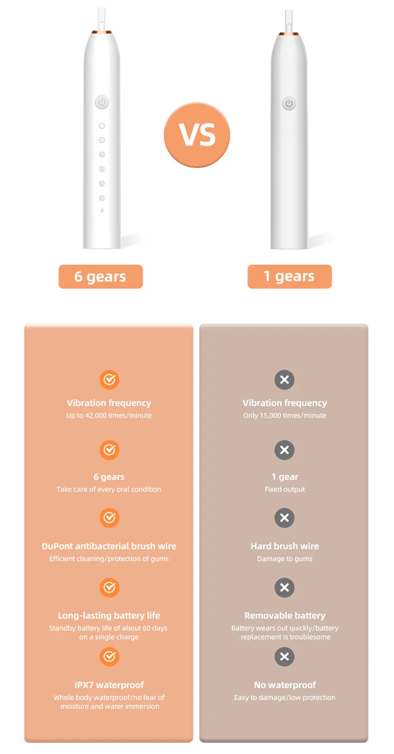 Built with an IPX7 waterproof design, this rechargeable toothbrush is safe to use in the shower and easy to maintain. Its USB charging feature provides convenience at home, in the office, or while traveling.